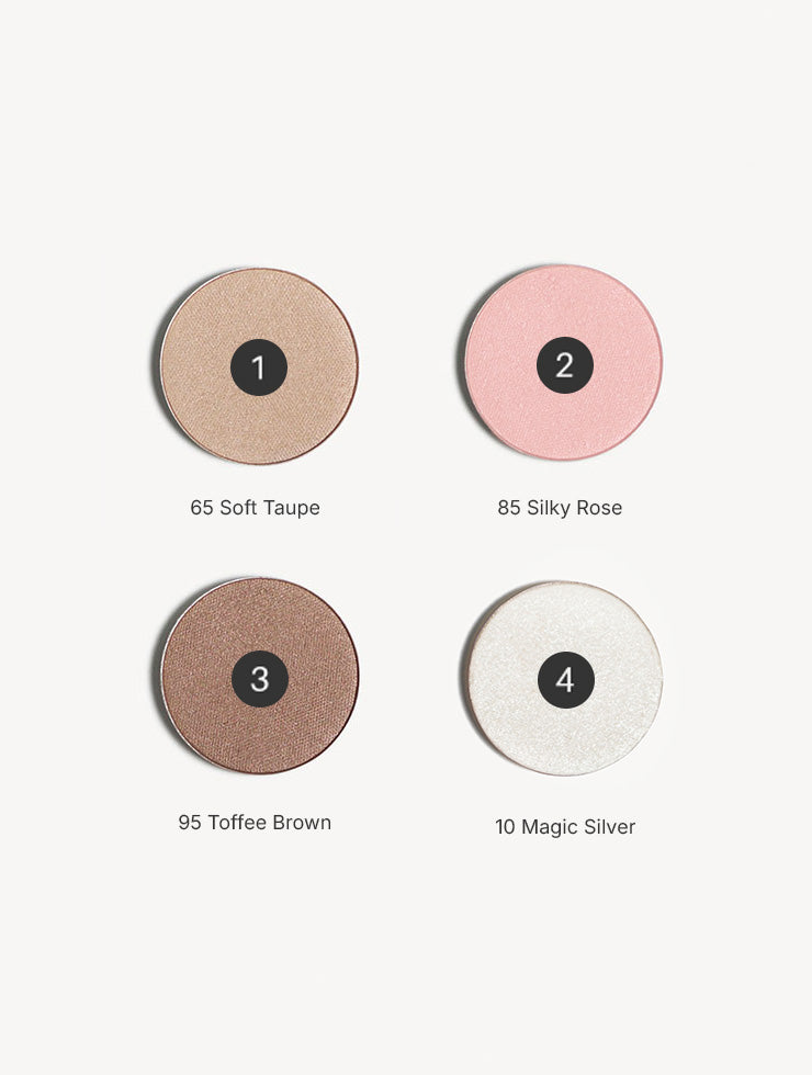 The palette contains the following shades: 15 Magic Gold, 60 Brilliant Copper, 85 Silky Rose, and 95 Toffee Brown. If you run out of a shade, you can refill the palette with a new eyeshadow. The palette closes with a magnetic clasp.