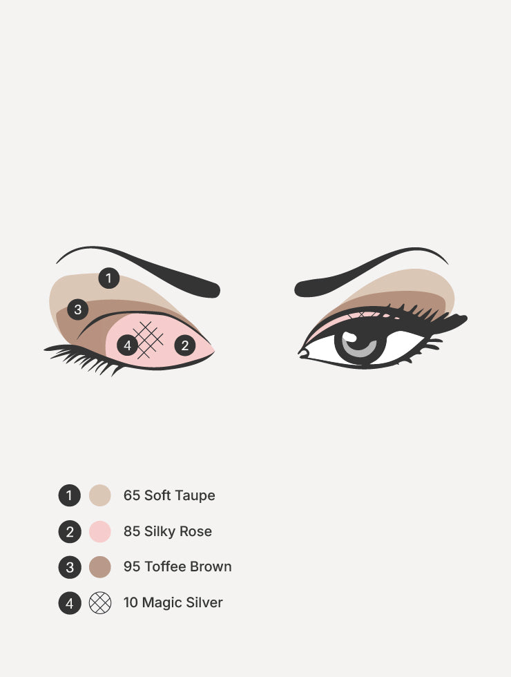 This set contains 1 Eyeshadow Palette and 4 Eyeshadow colors: 15 Magic Gold, 60 Brilliant Copper, 85 Silky Rose and 95 Toffee Brown.